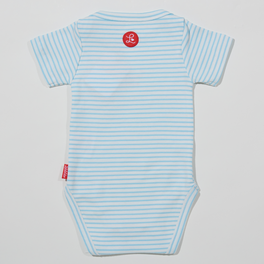 Bald verfügbarBabybody, Hellblau- weiss gestreift, Stickmotiv "Krabbe"